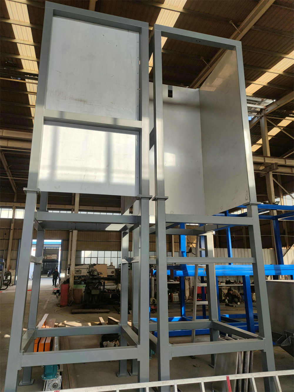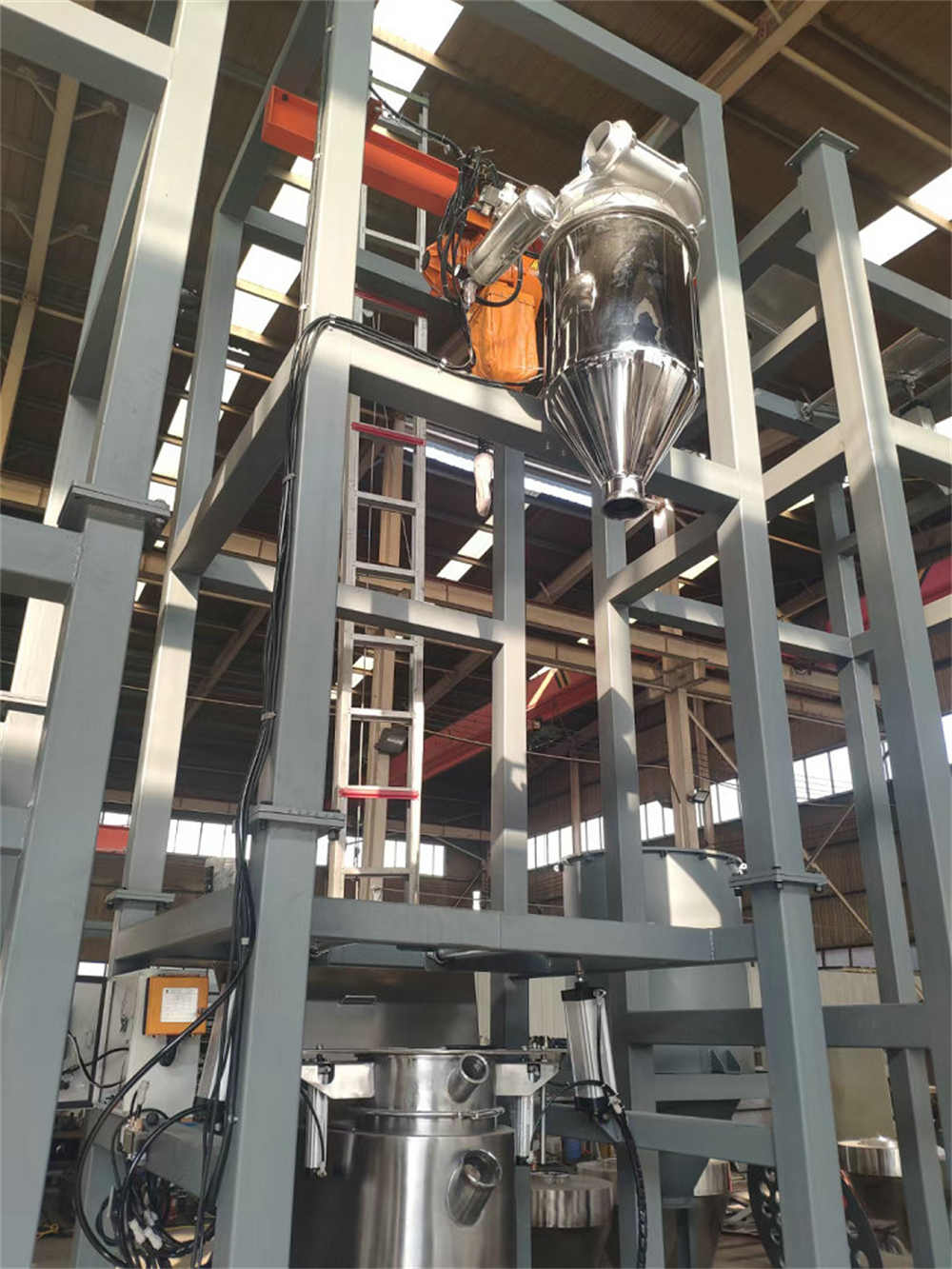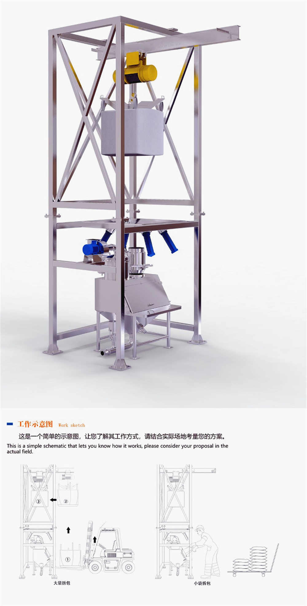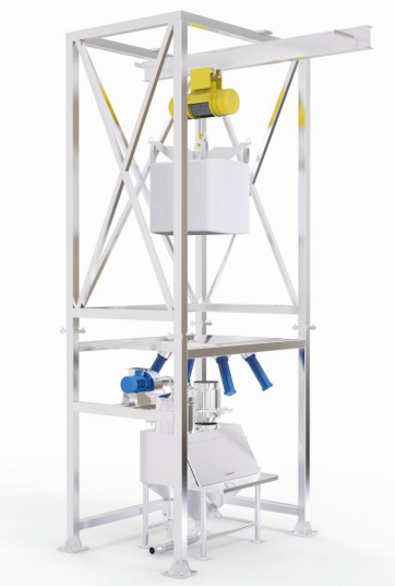 主體結構:卸料站框架支撐結構、噸袋起重裝置、噸袋吊架、噸袋支撐按摩板、袋口控制閥、密封裝置。