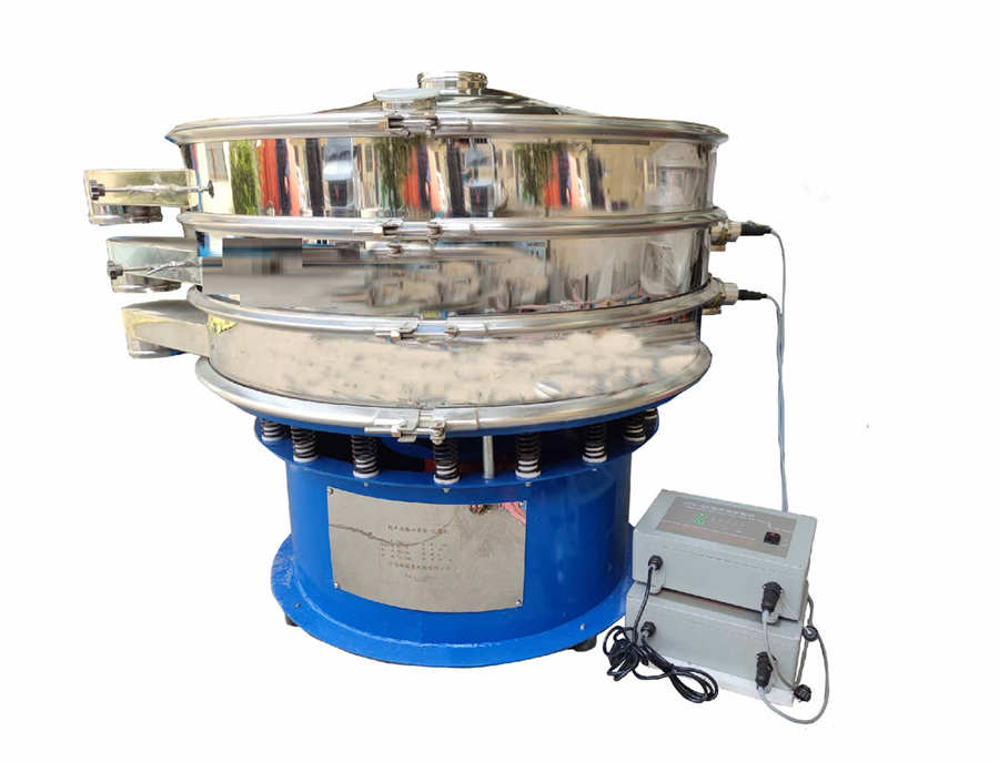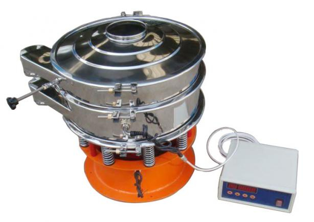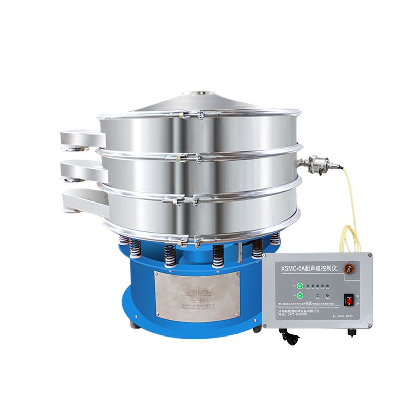 超聲波振動篩是將220V、50Hz或110V、60Hz電能轉化為36KHz的高頻電能,輸入超聲換能器,將其變成36KHz機械振動,產生的功率超聲波使篩網作高頻振動。篩網上的物料在作低頻旋振運動的同時,疊加上超聲振動,既可防止網孔堵塞,又可使篩分機提高產量和質量,從而達到快速篩分和清網的目的,使超微細粉篩分成為易事。該系統在傳統的振動篩基礎上在篩網上引入一個低振幅、高頻率的超聲振動波(機械波),以改變超微細分體的篩分性能。特別適合高附加值精細分體的用戶使用。