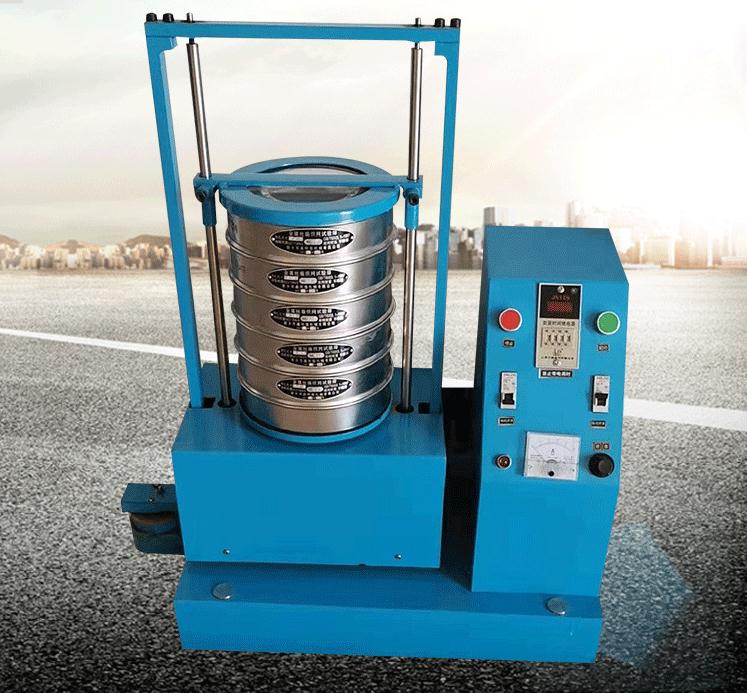 電機帶動齒輪通過同步帶傳動到主軸上,經齒輪變速后主軸按要求的轉速轉動,主軸帶動偏心輪使滑板做往復運動,帶動安裝在滑板托盤中的試驗篩左右搖動,同時主軸帶動頂桿齒輪轉動,變速后頂桿齒輪通過凸輪頂擊頂桿,頂桿使拍錘上下拍擊試驗篩上蓋,使得試驗篩、分樣篩中的物料往復和上下振動,使小于試驗篩的篩面網孔的物料顆粒篩分進下層試驗篩,如此層層篩選,使每層試驗篩內只留相同粒度的物料。達到不同粒度的分離并確定此物料的粒度組成。