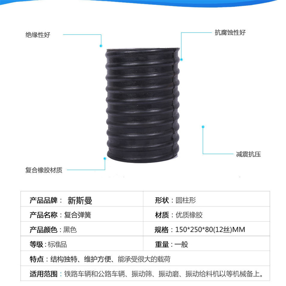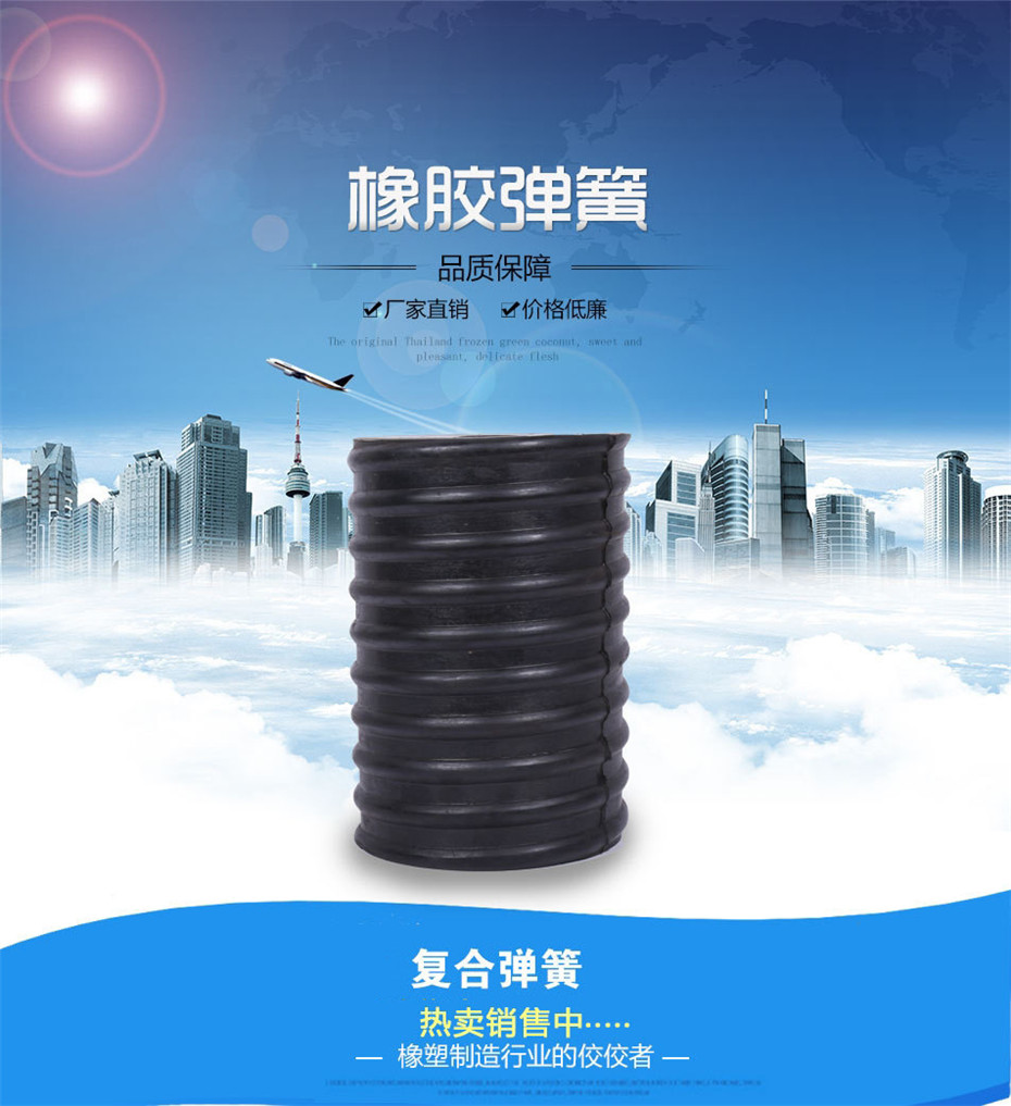 復合彈簧:是由金屬螺旋彈簧和橡膠復合在一起的園筒狀彈性體。該產品優于金屬彈簧,具有抗腐蝕性好、壽命長等優點,與其它彈簧相比,減振能力強,緩沖效果好。