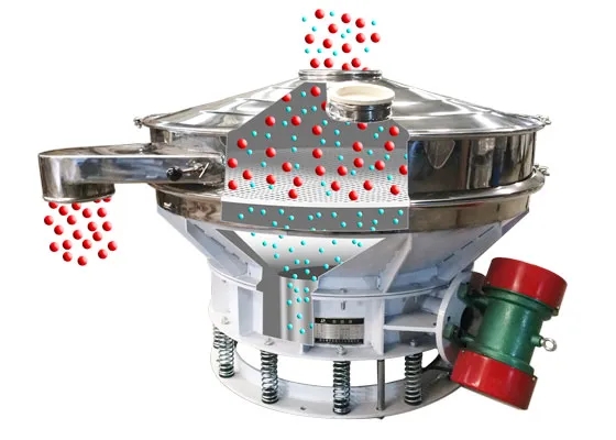 直排篩的作用原理是振動電機軸上下端的兩組偏心塊(不平衡偏心塊),將振動電機的旋轉運動變為水平、垂直、傾斜以及離心作用的多作用力重疊,再將這種作用力傳遞給篩面。改變上下偏心塊的相位角和可以改變激振力的大小和物料的運動軌跡。