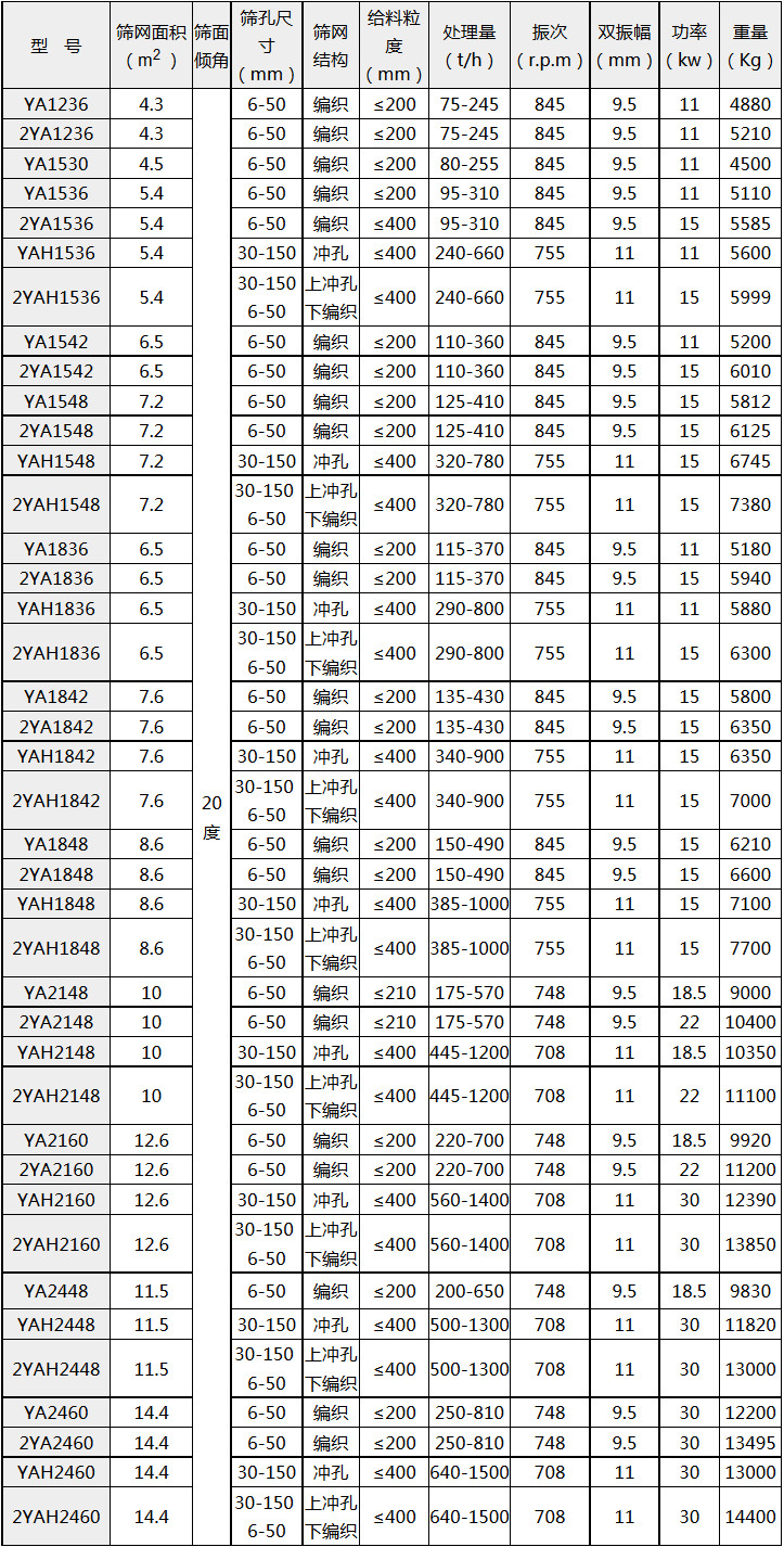 YA系列圓振動篩的主要技術參數: