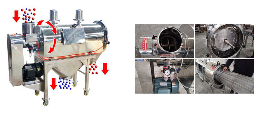 本設備篩網為圓筒狀,置于機體內,物料通過螺旋輸送系統后與氣流混合、霧化進入網筒內,通過網筒內風輪葉片使物料同時受到離心力和旋風推進力,從而使物料噴射過網,過網的物料從細料排出口排出,不能過網的物料沿筒壁從粗料排出口排出,達到快速分離的目的。