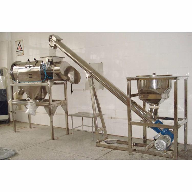 本設(shè)備篩網(wǎng)為圓筒狀,置于機(jī)體內(nèi),物料通過螺旋輸送系統(tǒng)后與氣流混合、霧化進(jìn)入網(wǎng)筒內(nèi),通過網(wǎng)筒內(nèi)風(fēng)輪葉片使物料同時(shí)受到離心力和旋風(fēng)推進(jìn)力,從而使物料噴射過網(wǎng),過網(wǎng)的物料從細(xì)料排出口排出,不能過網(wǎng)的物料沿筒壁從粗料排出口排出,達(dá)到快速分離的目的。