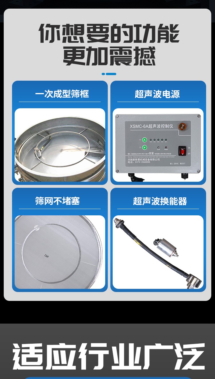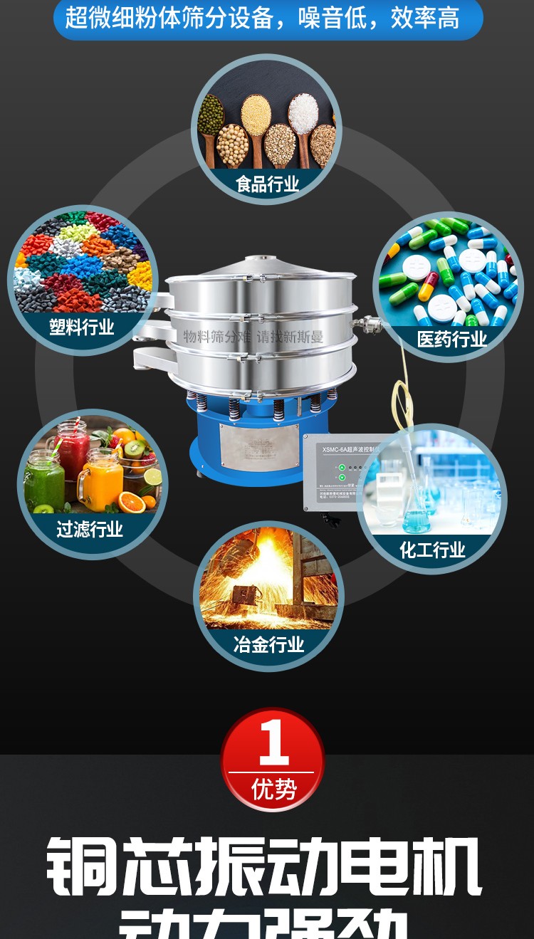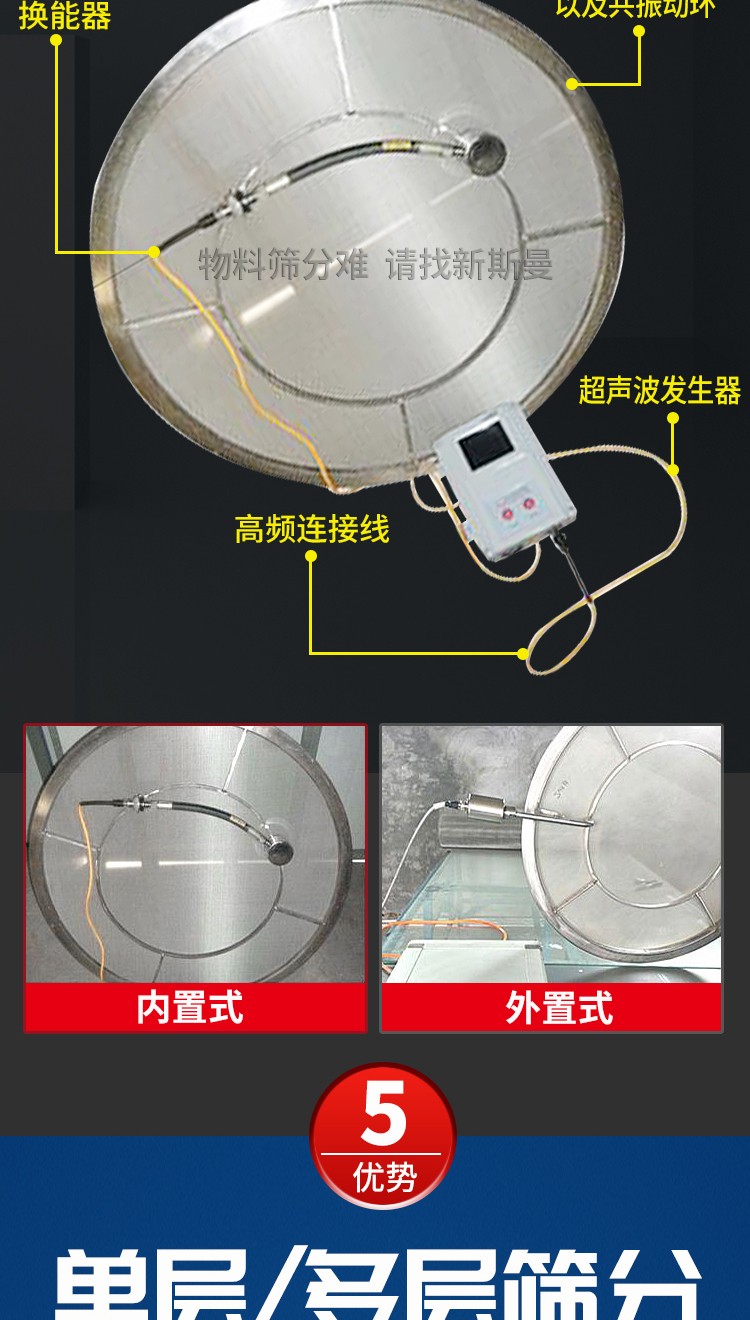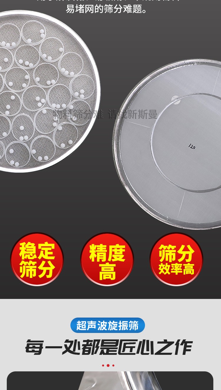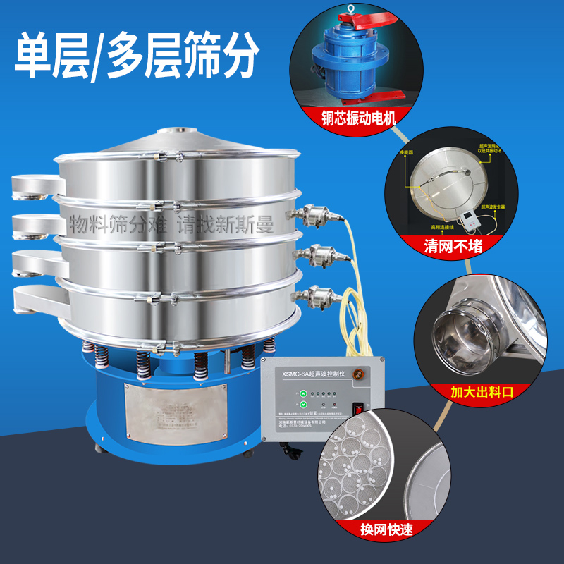 超聲波振動篩是將220V、50Hz或110V、60Hz電能轉化為36KHz的高頻電能,輸入超聲換能器,將其變成36KHz機械振動,產生的功率超聲波使篩網作高頻振動。篩網上的物料在作低頻旋振運動的同時,疊加上超聲振動,既可防止網孔堵塞,又可使篩分機提高產量和質量,從而達到快速篩分和清網的目的,使超微細粉篩分成為易事。該系統(tǒng)在傳統(tǒng)的振動篩基礎上在篩網上引入一個低振幅、高頻率的超聲振動波(機械波),以改變超微細分體的篩分性能。新斯曼系列超聲波旋振篩是在旋振篩基礎上加裝了一套超聲波篩分系統(tǒng),能有效解決物料:強吸附性、易團聚、高靜電、高精細、高密度、輕比重等篩分難題,具有優(yōu)越的性能!篩分精度比普通旋振篩可提高1—70%,產量可提高0.5-10倍。干粉粒度可分級到25μm(600目)。特別適合高附加值精細分體的用戶使用。
