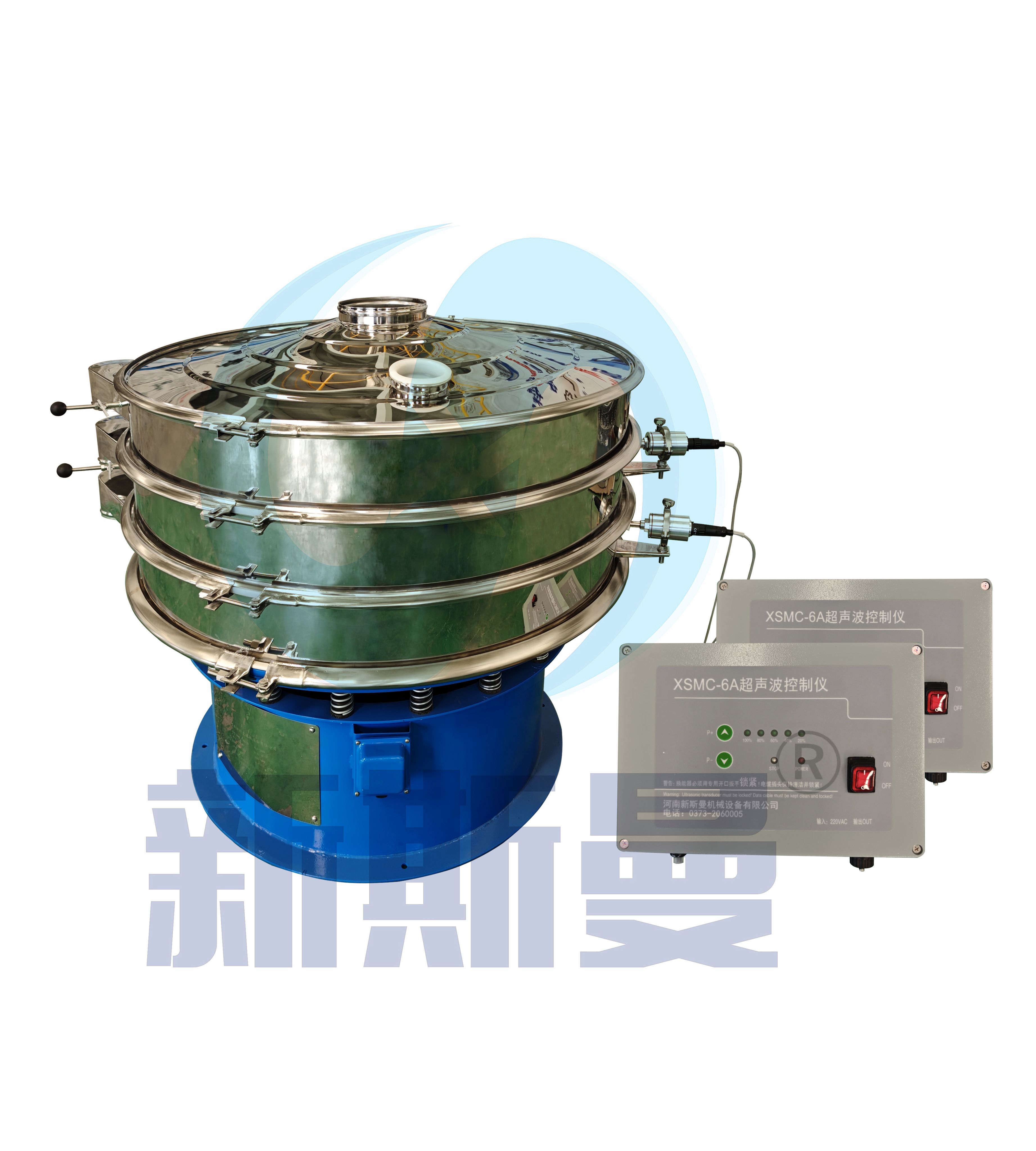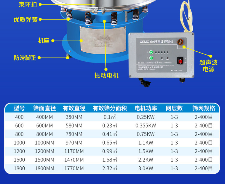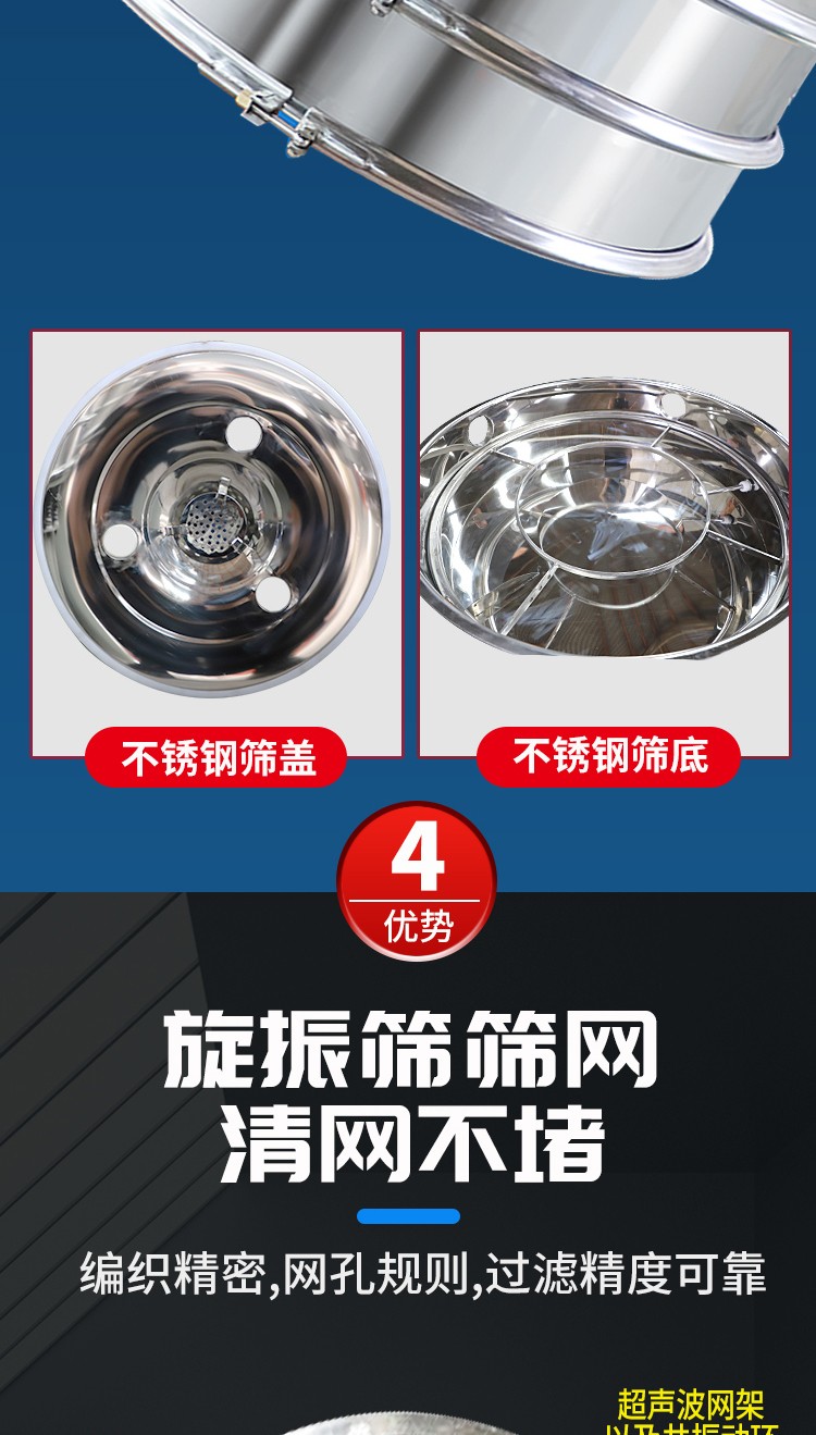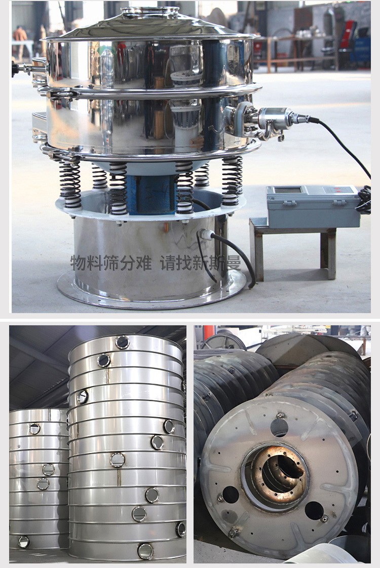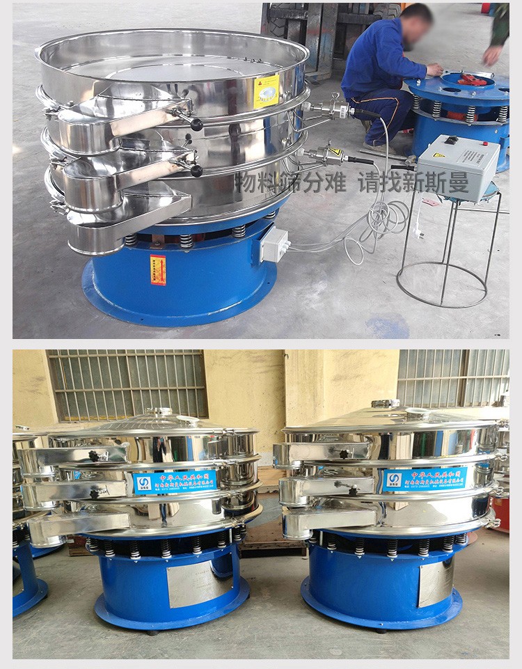 超聲波振動篩是將220V、50Hz或110V、60Hz電能轉化為36KHz的高頻電能,輸入超聲換能器,將其變成36KHz機械振動,產生的功率超聲波使篩網作高頻振動。篩網上的物料在作低頻旋振運動的同時,疊加上超聲振動,既可防止網孔堵塞,又可使篩分機提高產量和質量,從而達到快速篩分和清網的目的,使超微細粉篩分成為易事。該系統(tǒng)在傳統(tǒng)的振動篩基礎上在篩網上引入一個低振幅、高頻率的超聲振動波(機械波),以改變超微細分體的篩分性能。新斯曼系列超聲波旋振篩是在旋振篩基礎上加裝了一套超聲波篩分系統(tǒng),能有效解決物料:強吸附性、易團聚、高靜電、高精細、高密度、輕比重等篩分難題,具有優(yōu)越的性能!篩分精度比普通旋振篩可提高1—70%,產量可提高0.5-10倍。干粉粒度可分級到25μm(600目)。特別適合高附加值精細分體的用戶使用。