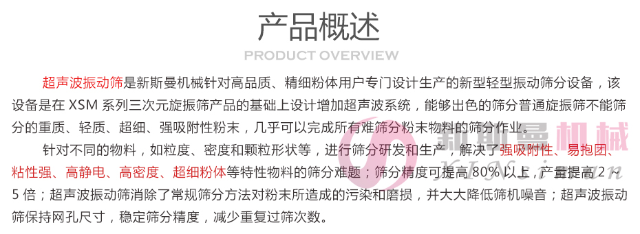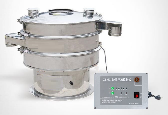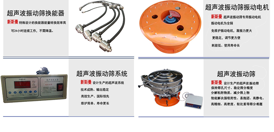 超聲波振動篩是將220V、50Hz或110V、60Hz電能轉化為36KHz的高頻電能,輸入超聲換能器,將其變成36KHz機械振動,產生的功率超聲波使篩網作高頻振動。篩網上的物料在作低頻旋振運動的同時,疊加上超聲振動,既可防止網孔堵塞,又可使篩分機提高產量和質量,從而達到快速篩分和清網的目的,使超微細粉篩分成為易事。該系統在傳統的振動篩基礎上在篩網上引入一個低振幅、高頻率的超聲振動波(機械波),以改變超微細分體的篩分性能。特別適合高附加值精細分體的用戶使用。